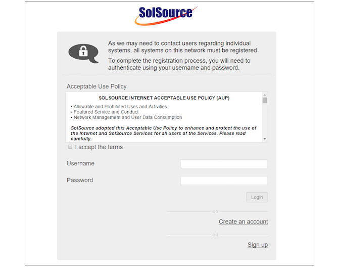 SolSoure's wifi systems support device and account registration mechanisms including captive portal solutions. Contrary to many captive portal solutions, once authenticated, SolSource's system will automatically give your residents access to the network without having to authenticate each time.